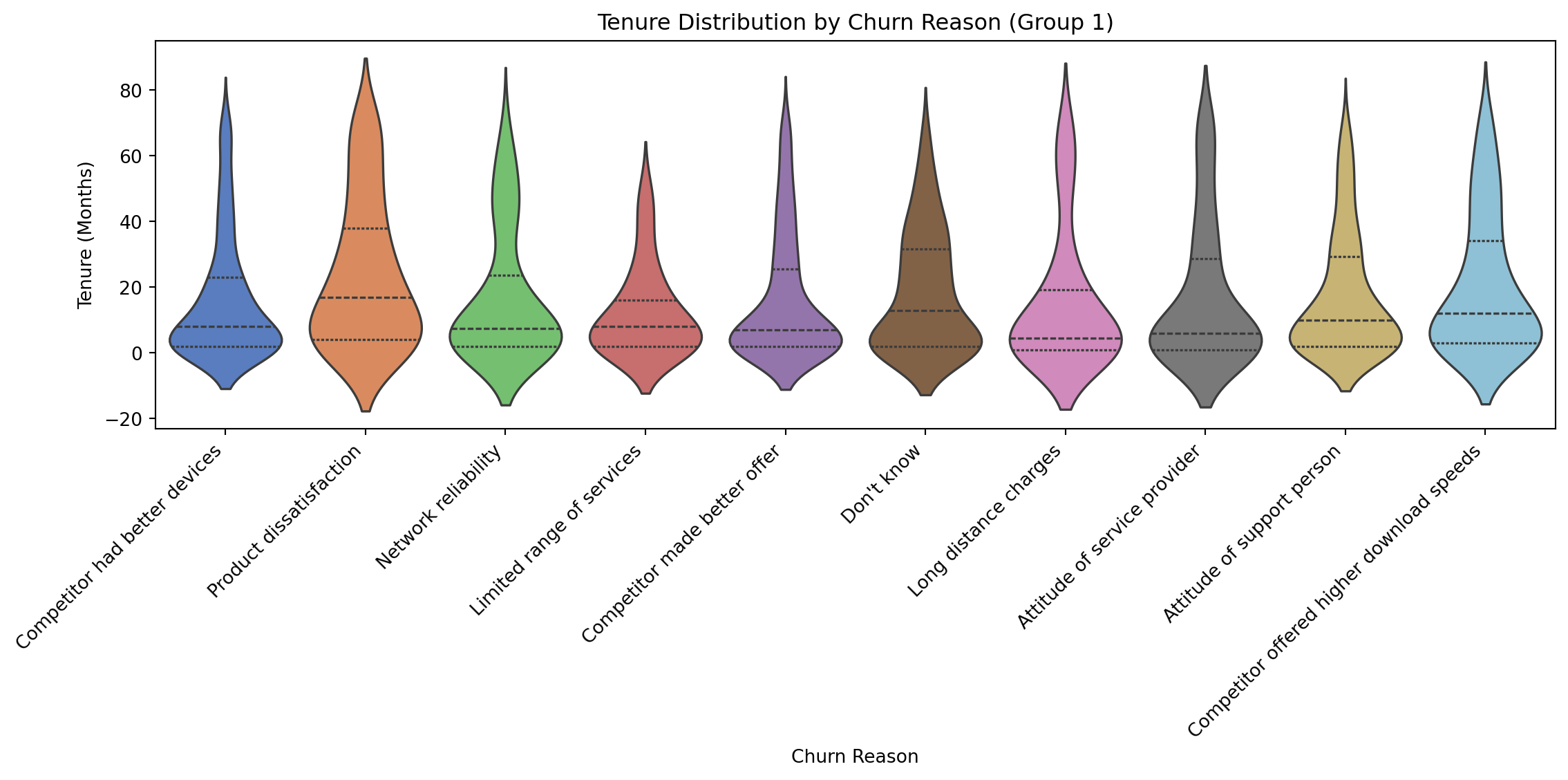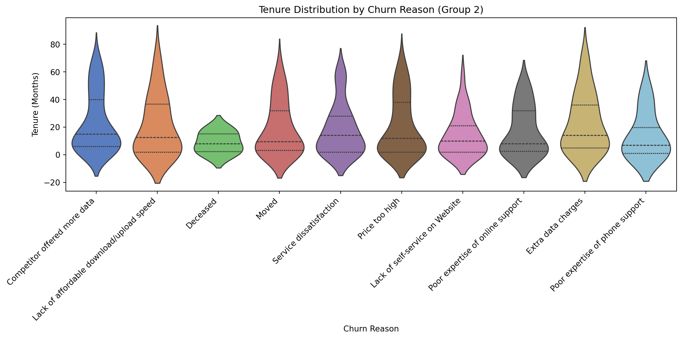 - Churn Reasons: Violin plots highlight tenure-based churn patterns, guiding targeted interventions.
